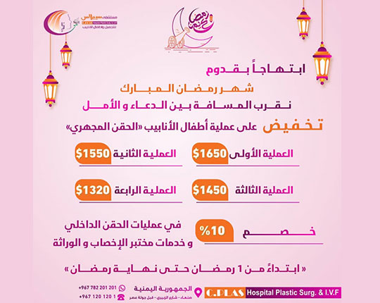 بما أن رسالة الطب السامية هي المحافظة على صحة الإنسان والعمل من أجل راحته وسعادته فكرنا في أكثر المشكلات الصحية التي تجعل الإنسان يعاني من السفر إلى خارج الوطن فوجدنا مشكلة العقم على رأسها والتشوهات سواء الخلقية أو المكتسبة كالحروق والإمراض الوراثية التي يمكن تلافيها قبل وقوعها. إقرأ المزيد